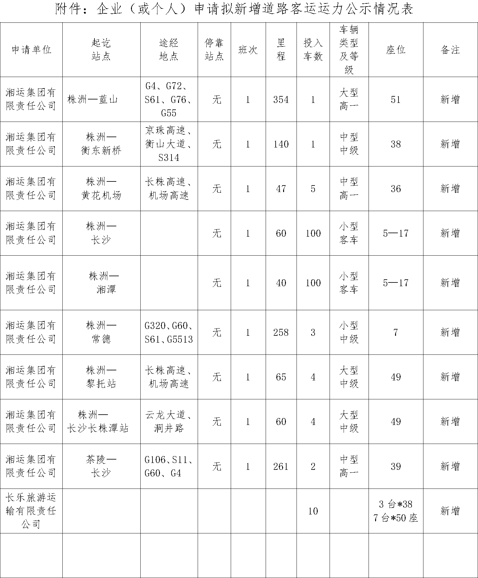 株洲市企业(或个人)申请拟新增道路客运运力公示