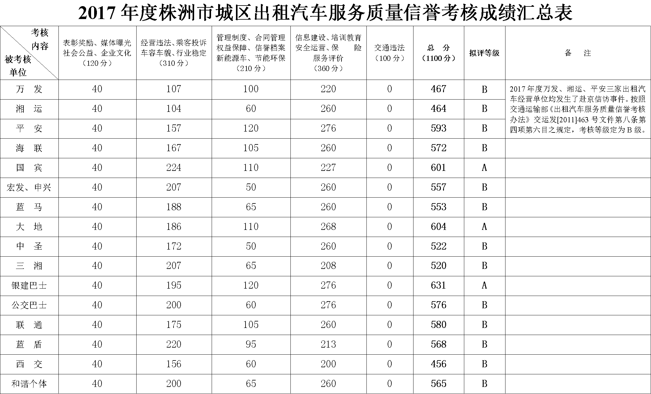 2017年度株洲市城区出租汽车服务质量信誉考核成绩汇总表公示