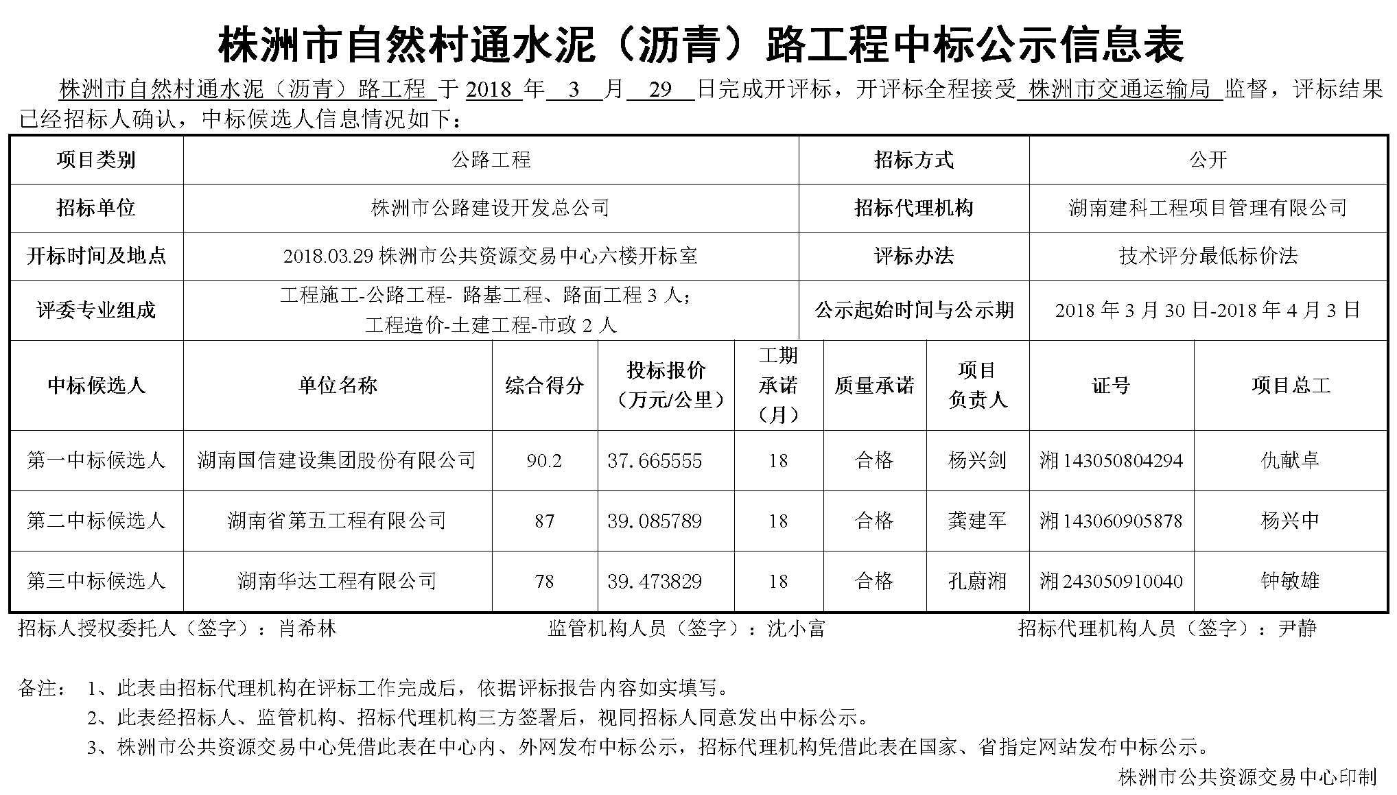 株洲市自然村通水泥(沥青)路工程中标公示信息表
