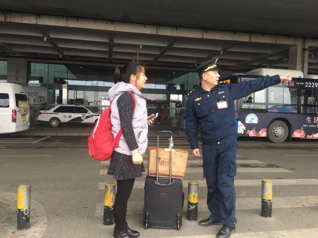2月15日(除夕),株洲市交通行政执法监督处的执法人员为旅客指路。(办公室 海事局 运管处 执法处)