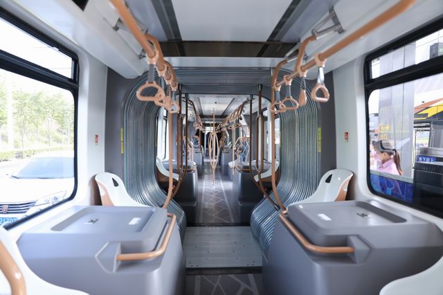 除此之外,相比绿款智轨列车,本次试运行的两列智轨列车在外观上,分别采用了时尚橘、蓝白相间两种不同的全新配色设计,清新动感的外形为城市增添了一道靓丽的风景。在安全性、舒适性和适用性等方面也有较大优化提升:增加了360度环视系统和车辆雷达等安全防护设施,运行安全得到进一步保障;在内部空间布局方面,增加了折叠座椅,可以提供更多座位,同时对扶手高度和数量也进行了优化调整,更加富有人性化设计。在智能驾驶方面,车辆具备半自动化驾驶能力,正常情况下司机只需进行辅助驾驶,车辆停靠站等可以依靠车辆自动循迹功能予以精准实现。
