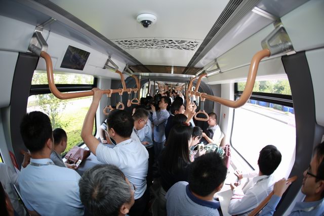 中国工程院院士刘友梅、丁荣军,宜宾市副市长廖文彬,株洲市领导何剑波,谭可敏,高新区党工委书记、天元区委书记周建光见证智轨快运系统示范线的试运行。(运输管理科 办公室)